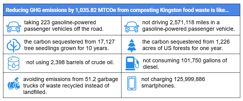 Currently, trash generated in the City of Kingston is trucked approximately 300+ miles to Seneca Meadows Landfill in Central New York. By source separating food scraps and pulling them out of the waste stream, the food scraps only travel 5 miles to Ulster County Resource Recovery Agency on Flatbush Road where they are processed into compost on site within just a few months and then sold locally as a soil amendment. With this process, we are able to eliminate the GHG emissions from trucking our waste to the landfill, free up space in the landfill, and recycle our waste into a usable product.